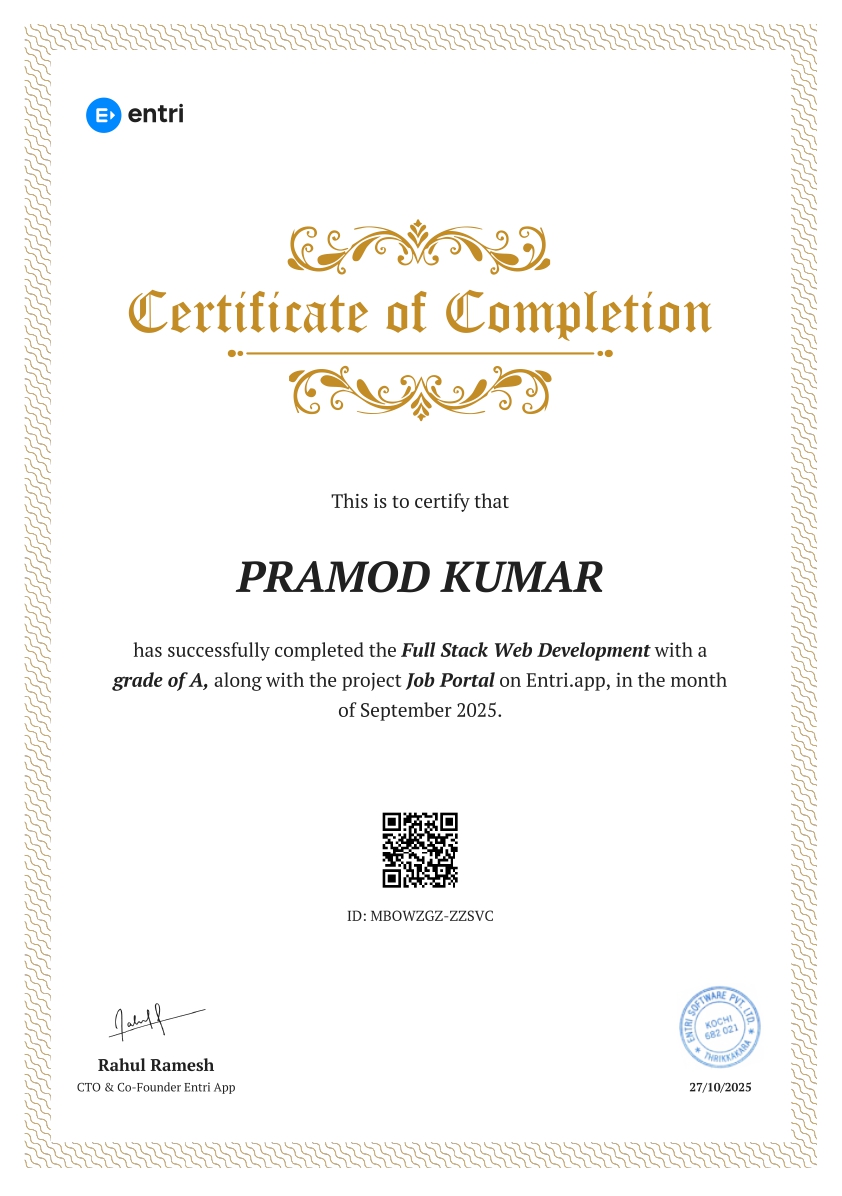 Nov 2024 – Sep 2025I successfully completed the MERN Full Stack Development course at Entri Elevate Software Pvt Ltd, where I gained hands-on experience in building full-stack applications using MongoDB, Express.js, React.js, and Node.js. During the course, I worked on real-world projects that enhanced my skills in front-end and back-end development, RESTful API creation, authentication, database management, and deployment.