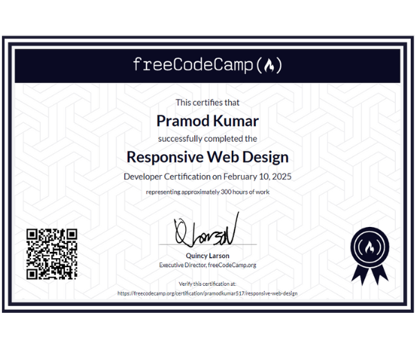 freeCodeCampLearned semantic HTML, CSS layouts, responsive design principles, accessibility basics, and modern front-end structuring techniques for building device-friendly web interfaces.